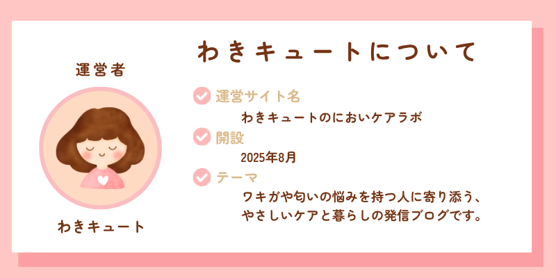『わきキュートのにおいケアラボ』は、ワキガや体臭の悩みを抱える方に向けて、安心して暮らしを楽しめるようなライフケア情報を発信するブログです。